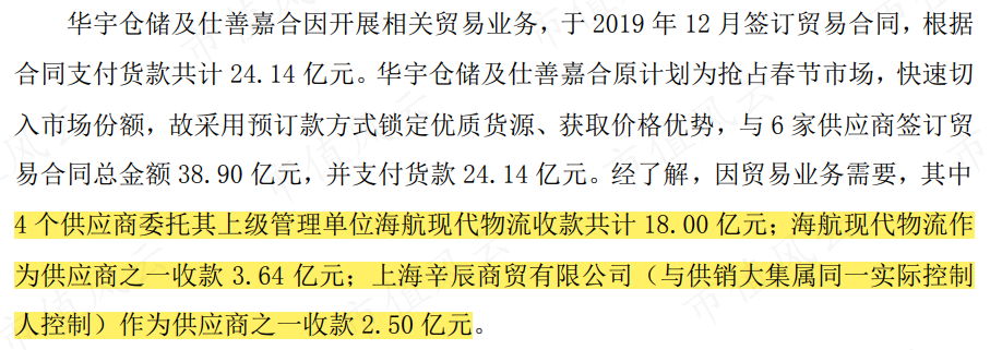还是在2019年12月,华宇仓储与仕善嘉合随及开始贸易业务,签订贸易合同,并快速支付了24.14亿元。