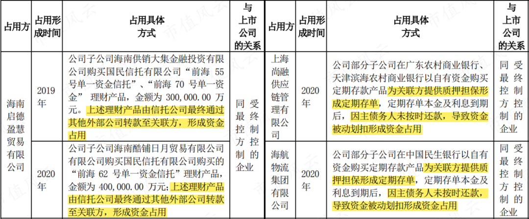 截至2020年末,海航对供销大集费非经营性资金占用余额高达199.53亿元,占同期净资产的77%。