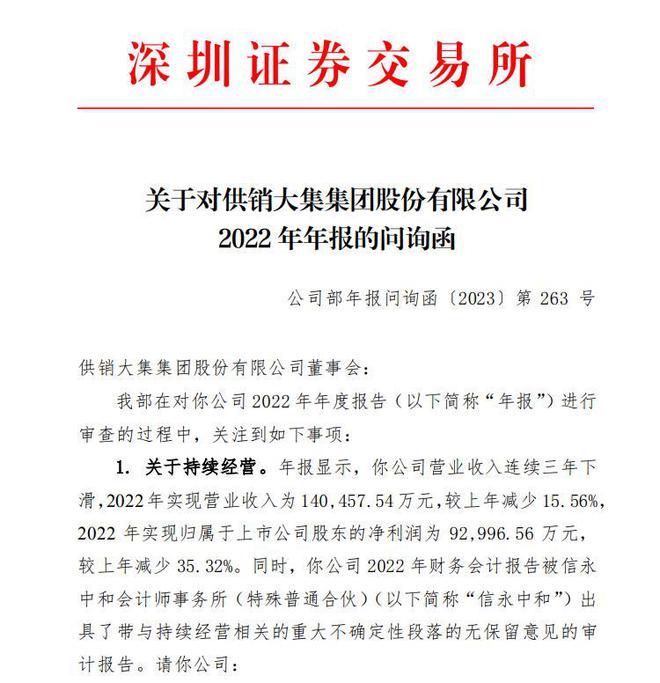 年报显示,ST大集营业收入连续三年下滑,2022年实现营业收入140457.54万元,较上年减少15.56%,净利润为92996.56万元,较上年减少35.32%。同时,2022年财务会计报告被信永中和会计师事务所(特殊普通合伙)(下称“信永中和”)出具了带与持续经营相关的重大不确定性段落的无保留意见的审计报告。