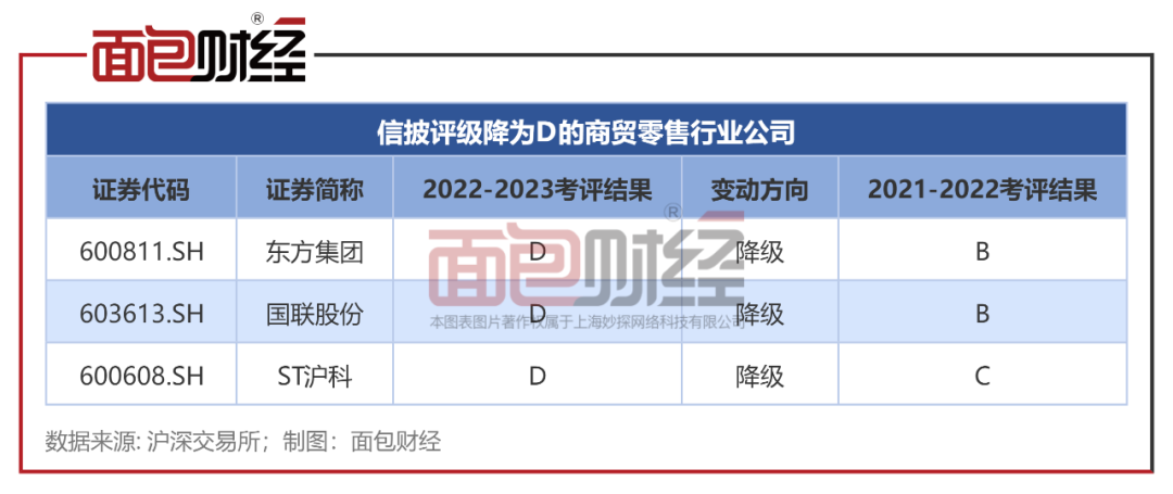具体来看,评价结果为D的8家商贸零售企业中,东方集团、国联股份和ST沪科为降级。其中,东方集团、国联股份从上年度的B级连降两级至D级。