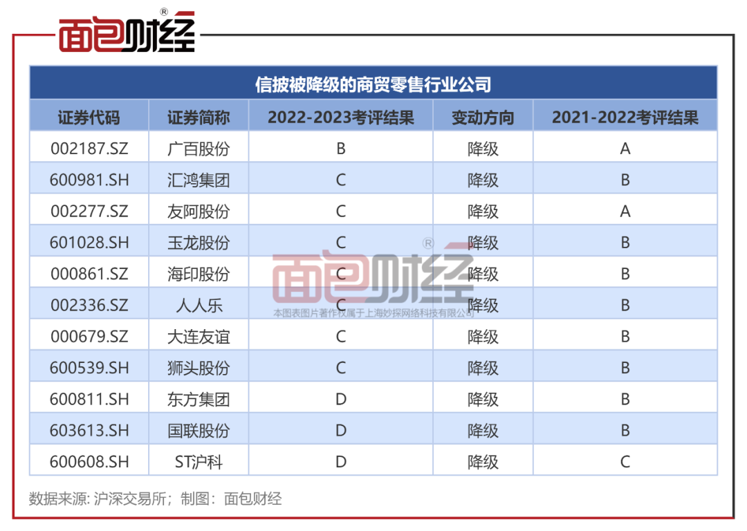评价结果显示,2022-2023年度被降级的商贸零售企业有11家,其中10家被降为C或者D。7家被降级为C的企业包括汇鸿集团、友阿股份、玉龙股份、海印股份、人人乐等。