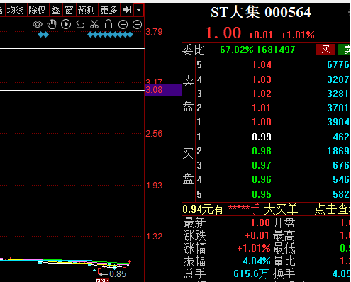 然而,11月3日的股市交易为ST大集带来了一线生机。在收盘前的关键时刻,出现了高达51.8万手的大规模集合竞价买单,助力ST大集的股价精准触及1元的关口。根据相关规定,这一收盘价才使得ST大集暂时摆脱了退市的威胁。