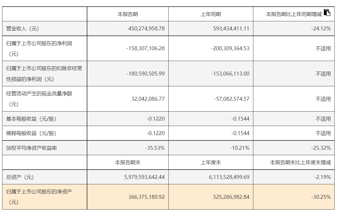 2025年上半年,该公司实现营收4.5亿元,同比减少24.12%;归属于上市公司股东的净利润-1.58亿元。