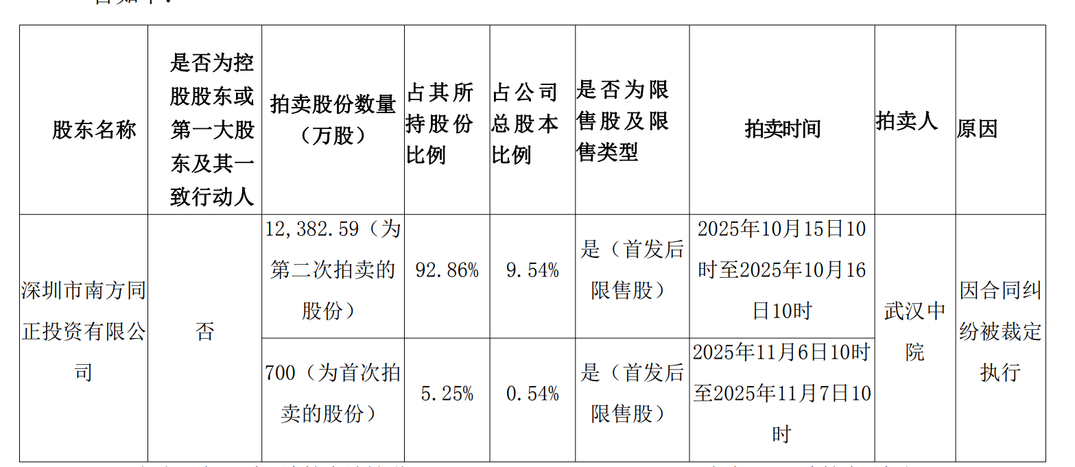 根据公告,此次司法拍卖标的为公司持股 5%以上股东南方同正所持海南海药已质押的 1.31亿股股票,占其所持公司全部股份的98.11%,占公司总股本的 10.08%。其中涉及第二次拍卖的股份1.24亿股拟于2025年 10 月 15 日 10 时至 2025 年 10 月 16 日 10 时止(延时除外)进行公开司法拍卖,涉及首次拍卖的股份 700万股拟于 2025 年 11 月6 日10 时至2025年11 月 7 日 10 时止(延时除外)进行公开司法拍卖。如上述所涉司法拍卖股份全部拍卖成功,南方同正持有公司的股份将减少至 252.04万股,占公司总股本的0.19%。