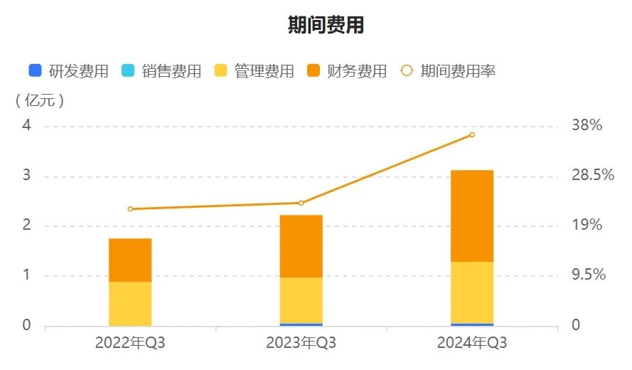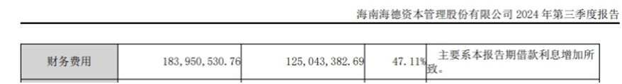 究其原因,从财报中可以看出,海德股份在三季度的管理费用和财务费用出现了大幅增加的情况。管理费用方面,今年三季度,海德股份同比增加了33.35%,达到了1.22亿元。而财务费用的增长更是引人注目,同比增加了47.11%,达到1.84亿元。尤为值得注意的是,这1.84亿全部是借款利息增加所致。