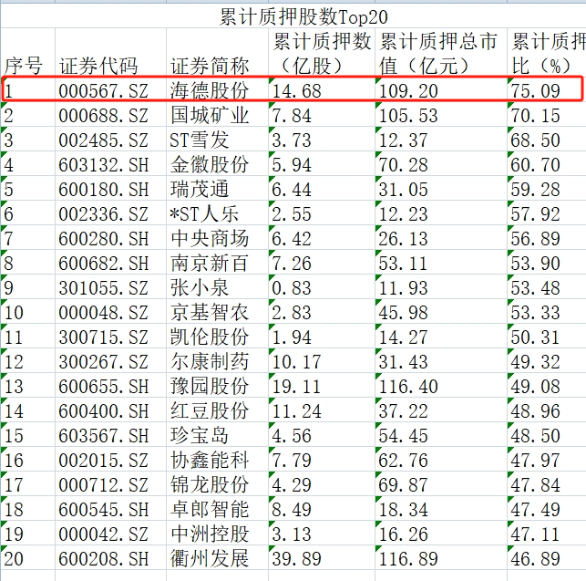 数据显示,截至11月28日,在A股市场累积质押股排名中,海德股份荣登“榜一”。