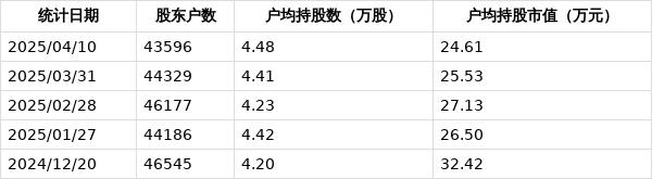 从4月17日公开信息显示,海德股份截至2025年4月10日公司股东户数为4.36万户,较上期(2025年3月31日)减少733户,降幅为1.65%,变化不大。