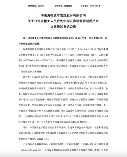 一人被立案调查,三家上市公司紧急发布公告。11月28日,海南海德资本管理股份有限公司(以下简称“ 海德股份 ”000567.SZ)发布公告,公司于2025年11月28日收到中国证监会送达的《立案告知书》。因公司及实际控制人王广西涉嫌信息披露违法违规,中国证监会决定对二者展开立案调查。