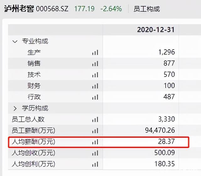 数据还显示,2020年该公司员工人均薪酬为28.37万元,比2019年的26.67万元要多出大约1.7万元。去年公司人均创利180万元,人均创收超过500万元。