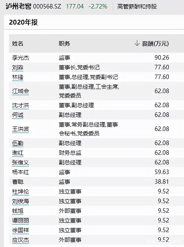 泸州老窖是地方国企,市值超过2500亿元。2020年,该公司薪酬最高的高层是监事李光杰,达到90万元。董事长和总经理薪酬都是77.6万元。独立董事薪酬不到10万元。