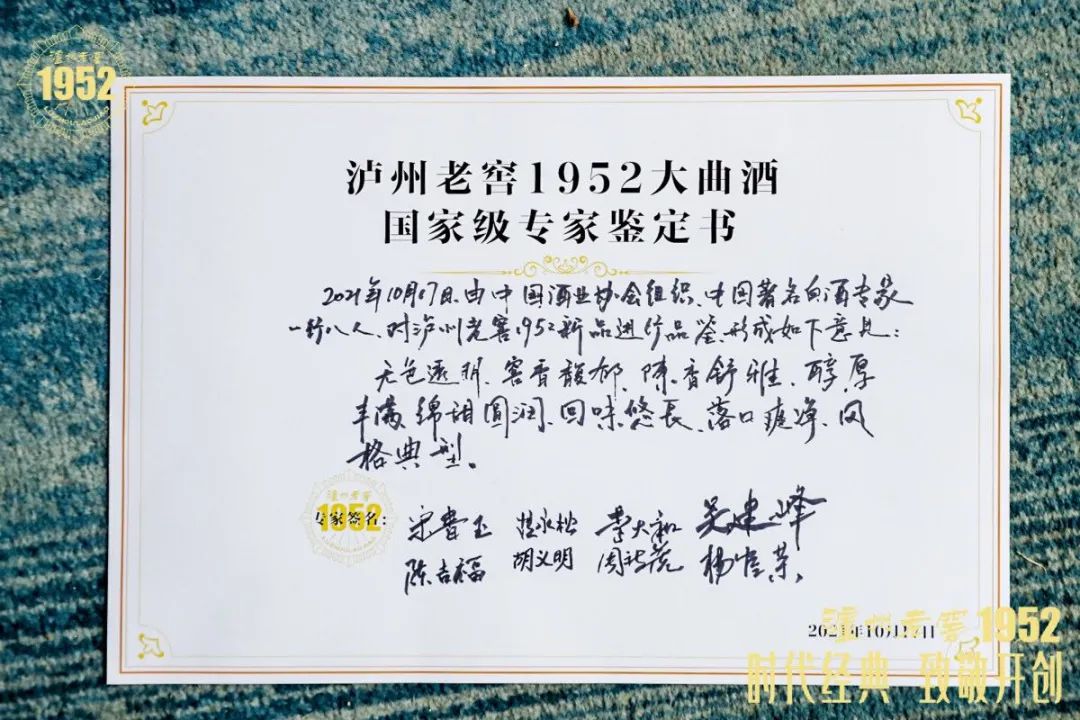 在发布会当天举行的“泸州老窖1952”专家鉴评会上,由中国酒业协会组织,中国酒业协会理事长宋书玉、四川中国白酒金三角协会副会长陈吉福、教授级高级工程师李大和、原四川大学食品与发酵工程研究所教授胡永松、江苏苏酒集团副总裁周新虎、江苏今世缘股份有限公司副董事长吴建峰、高级工程师胡义明、四川省酒业集团有限责任公司总经理、总工程师杨官荣八位著名白酒专家对泸州老窖1952进行了专业品鉴,最终形成了对泸州老窖1952酒体特色的一致鉴评——无色透明,窖香馥郁,陈香舒雅,醇厚丰满,绵甜圆润,回味悠长,落口爽净,风格典型。泸州老窖1952传承697年酿酒名门的浓香风骨,收获了专家鉴评团的高度肯定。