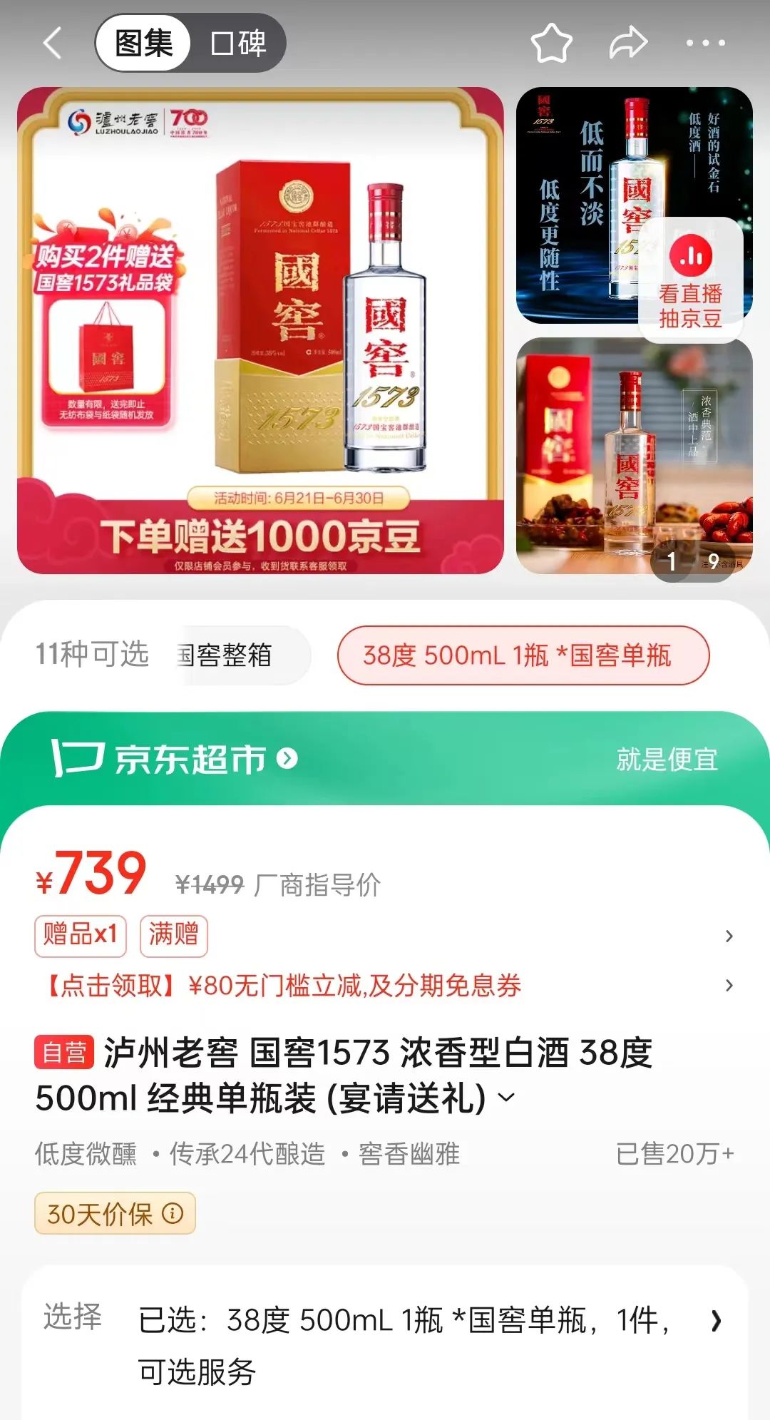 在京东电商平台搜索泸州老窖官方旗舰店,发现目前500ml的单瓶装38度国窖1573促销价739元,相较于厂商指导价1499元已经“折半价”在卖了。