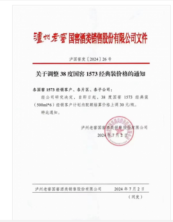 证券之星注意到,7月2日,泸州老窖国窖酒类销售股份有限公司(以下简称“泸州老窖国窖销售公司”)发布涨价通知,自即日起,38度国窖1573经典装(500ml*6)经销客户计划内配额结算价格上调30元/瓶。此前不久,泸州老窖还停止接收国窖38度经典装订单及货物发运。一套组合拳下来,38度国窖1573似乎萦绕着供不应求的氛围。然而,这层外衣下,恐隐藏着“控量保价”的真实目的。