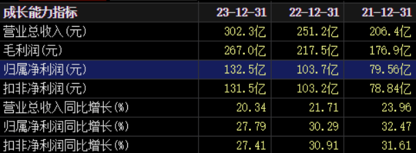 据了解,泸州老窖以专业化白酒产品设计、生产、销售为主要经营模式,主营“国窖1573”“泸州老窖”等系列白酒。2023年公司实现营业收入302.33亿元,同比增长20.34%;归母净利润132.46亿元,同比增长27.79%。而对比2021年、2022年,泸州老窖无论是营收、还是利润增速均出现放缓。