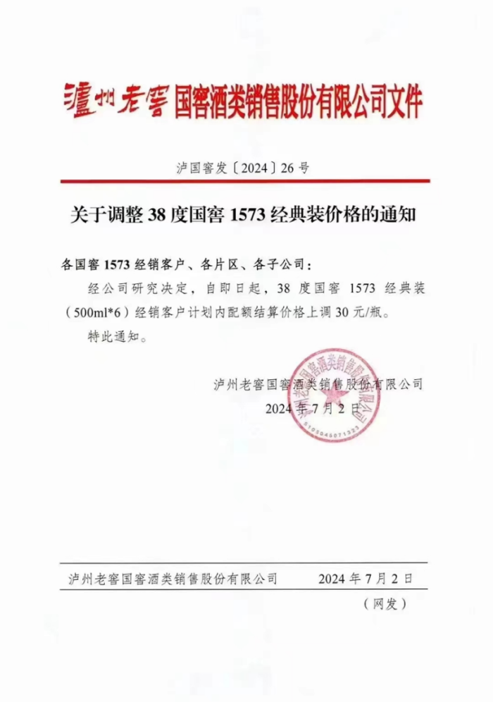 据市场信息,泸州老窖在六月末和7月初先后发布停货和涨价通知,针对其38度和52度国窖1573经典装大单品打出一套控量保价“组合拳”。