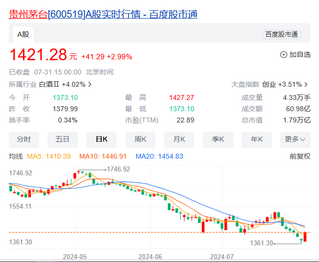 继6月股价创年内新低(最低跌至1414.01元/股)以来,7月底,贵州茅台的股价跌破1400元关口,7月30日最低跌至1361.3元/股,再创年内新低。
