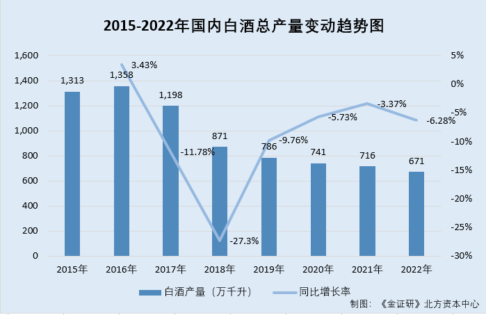 根据《金证研》北方资本中心研究,2016-2022年,国内白酒总体产量增速分别为3.43%、-11.78%、-27.3%、-9.76%、-5.73%、-3.37%、-6.28%。