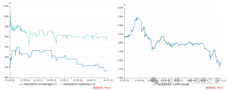 飞天茅台的批价变化是白酒行业景气的代表。今年飞天茅台批价大幅度下滑,从年初的2960元/瓶下跌到11月25日的2250元/瓶。五粮液和泸州老窖同为高端白酒企业之一,五粮液的批价基本保持稳定,普五年初为960元/瓶,11月25日为950元/瓶;而泸州老窖的国窖1573批价下滑幅度更大,从年初的875元/瓶下滑到11月25日的850元/瓶。
