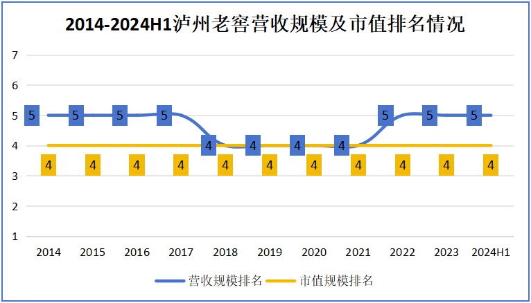 从2014年到2024上半年,无论是营收规模还是市值,泸州老窖都没有摸到过“梦中情三”的边,一切都和2015年没什么两样。
