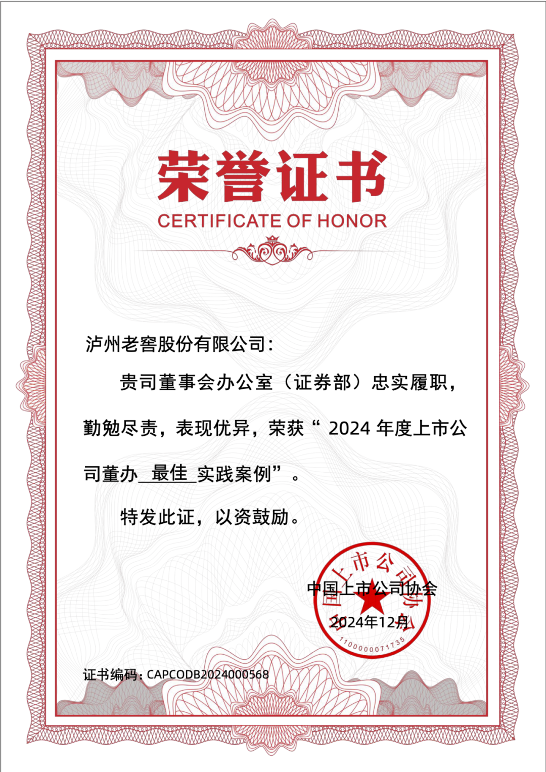 2024年12月19日,中国上市公司协会揭晓“2024上市公司董办最佳实践”案例征集活动评选结果。泸州老窖股份有限公司以优秀的公司治理、信息披露、市值管理和ESG建设,荣获“2024年度上市公司董办最佳实践案例”。