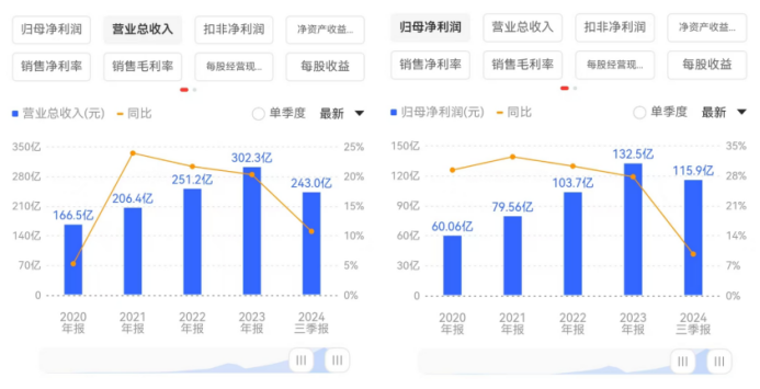 从上述业绩增速的下滑可以看出,2024年前三季度的营收、利润增速相比前几年可以说是断崖式下滑。