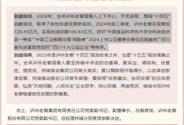 在官网这篇题为《蓄势攻坚冲刺跨越|泸州老窖举办2024年度总结表彰大会》报道中,作者发现泸州老窖的这次年会上,对于过去一年的总结是这样表述的:“刘淼指出,2024年,全体泸州老窖国窖人上下齐心、开拓进取,围绕‘十四五’战略规划,取得了良性快速发展新成效。2024年前三季度,泸州老窖(集团,非指上市公司。作者注)实现营收728.45亿元,实现利润总额166.63亿元”。
