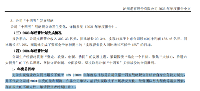 作者在泸州老窖(特指上市公司,下文均同)2023年年报中看到,对于2024年的经营目标,上市公司提出营收同比增长不低于15%,按照2023年营收302.3亿元测算,泸州老窖2024年的营收目标至少是在347亿元。