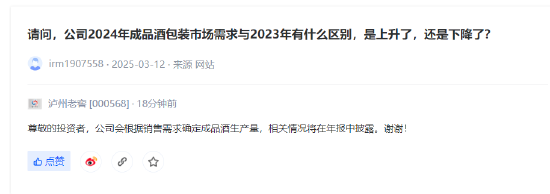 近日,有投资者在互动平台提问,公司2024年成品酒包装市场需求与2023年有什么区别,是上升了,还是下降了?