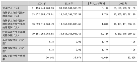 报告显示,2024年泸州老窖实现营收311.96亿元,同比微增3.19%;实现净利润134.73亿元,同比微增1.71%;实现扣非净利润134.00亿元,同比微增1.89%。