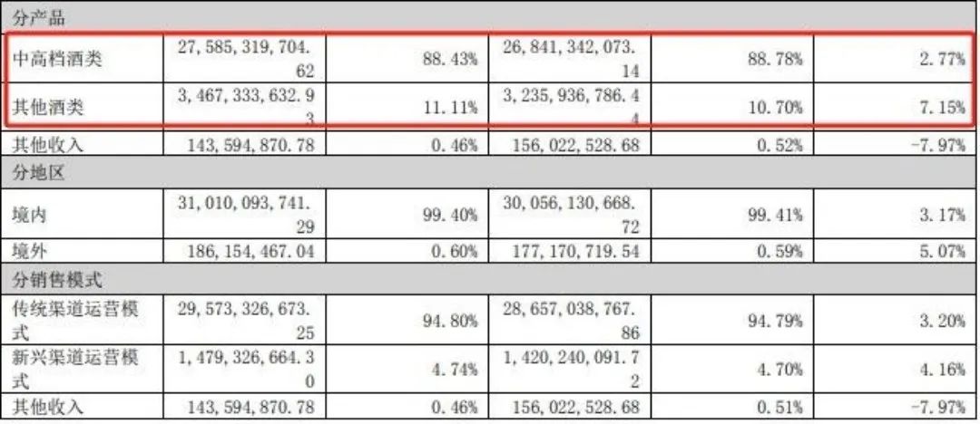 产品结构的优化是泸州老窖2024年的一大亮点,其中中高档酒更是成为拉动业绩增长的核心引擎。2024年,泸州老窖中高档酒类产量同比增长26.18%,销量同比增长14.39%,实现营收约275.85亿元,同比增长2.77%,为公司贡献了近九成营收。