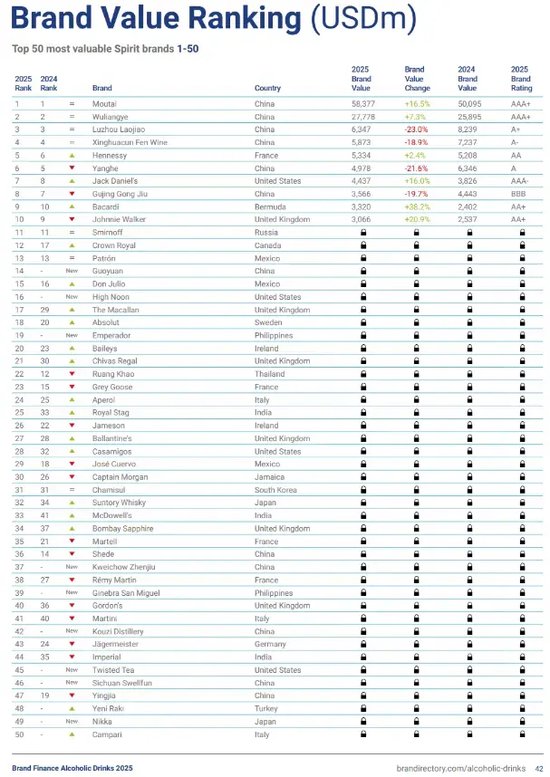 在《2025年全球烈酒品牌价值50强》子榜单中,中国有六个烈酒品牌进入榜单前十,其中茅台、五粮液、泸州老窖和杏花村汾酒仍稳居全球烈酒品牌前四名。洋河股份位列第六名,古井贡酒位列第八。
