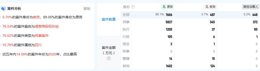 公开数据显示,泸州老窖涉及的司法案件总量为8541件,纠纷频繁。从案件类型分布来看,民事案件占比最高,达到76.62%。在案件主体身份方面,公司作为原告的案件占比89.05%,作为被告的占比5.7%。从案由构成来看,侵害商标权纠纷最为突出,占全部案件的76.54%。时间分布上,2020年是案件数量最多的年份,占近五年案件总量的14.09%。