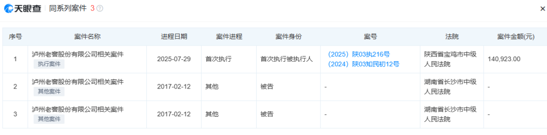 目前尚未披露本次执行涉及的具体纠纷详情,泸州老窖也未对外发布相应公告。信息显示,本起案件名称为泸州老窖股份有限公司相关案件,共包含三起同系列案件,2024年在陕西省宝鸡市中级人民法院完成民事一审,案号为(2024)陕03知民初12号。该系列包含2017年2月12日由湖南省长沙市中级人民法院审理的两起案件,泸州老窖在两案中均作为被告。