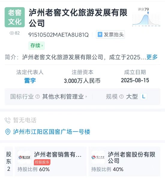 近日,泸州老窖文化旅游发展有限公司成立,注册资本3000万元,经营范围包含服务消费机器人销售、化妆品批发、商业综合体管理服务、酒店管理等。股权穿透显示,该公司由泸州老窖销售有限公司与泸州老窖股份有限公司分别持股60%、40%。