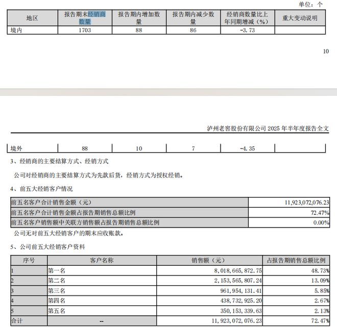 值得注意的是,泸州老窖经销客户集中度进一步提高,数据显示,今年上半年公司前五大经销客户合计销售额高达119.23亿元,占据销售总额的比例高达72.47%,相较于去年67.28%的占比进一步提升;其中第一大经销客户销售额高达80.19亿元,占比高达48.73%,第二大经销客户销售额高达21.54亿元,占13.09%。