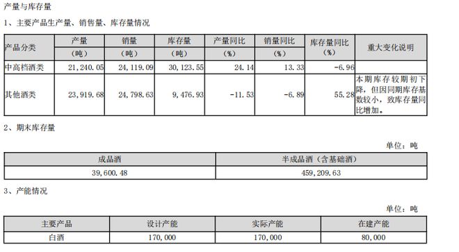 库存量方面,截至今年6月末,泸州老窖成品酒库存量为3.96万吨,半成品酒(含基础酒)库存量为45.92万吨;其中,中高档酒的库存为3.01万吨,同比下滑6.96%,其他酒类的库存为9476.93吨,同比大增55.28%。对于其他酒类库存的激增,泸州老窖表示,因去年同期库存基数较小,致库存量同比增加,本期库存较期初下降。