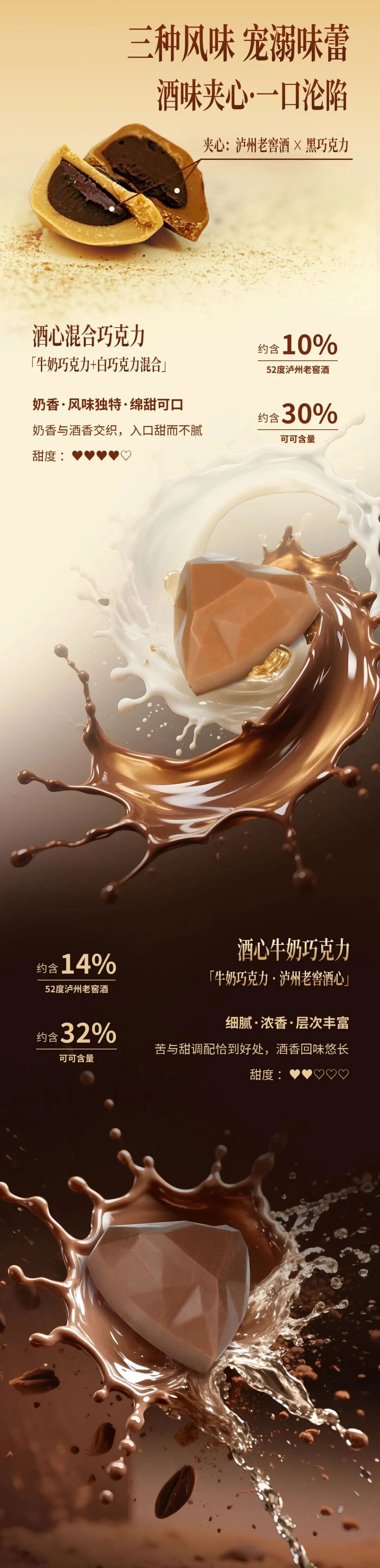 牛奶巧克力+白巧克力混合风味版:约 30%的可可含量,搭配约 10%的 52 度泸州老窖酒,奶香的浓郁与白巧的甜美交织着酒香,创造出绵甜可口、甜而不腻的独特风味,让人瞬间愉悦。