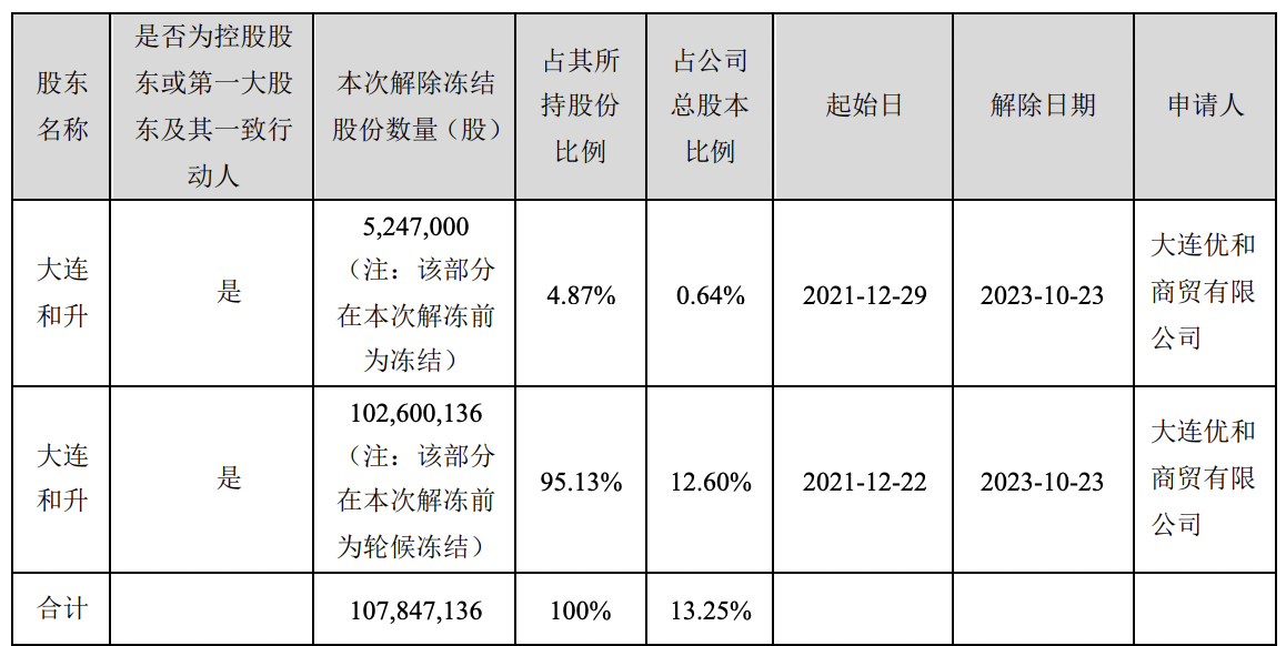 公告显示,大连和升控股集团有限公司持有新大洲A的107,847,136股份解除冻结,占其所持股份比例100%,占公司总股本比例13.25%,解除日期为2023年10月23日,申请人为大连优和商贸有限公司。