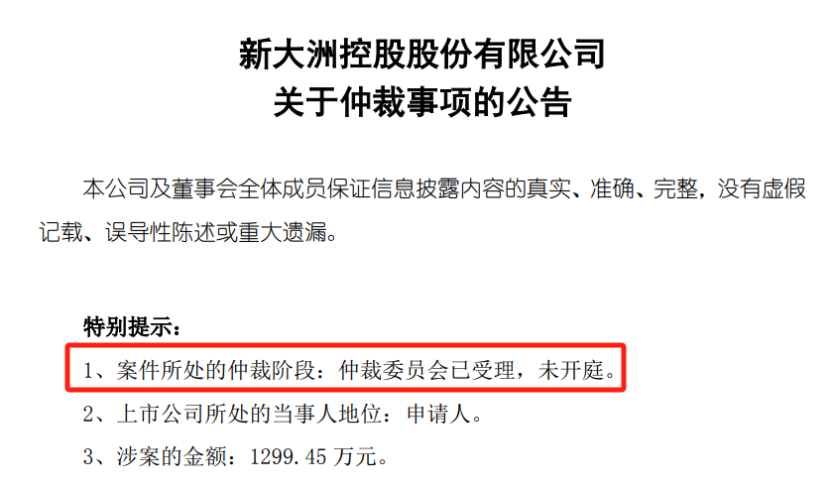 1月26日,新大洲控股股份有限公司披露了关于仲裁事项的公告。新大洲控股股份有限公司与枣庄矿业(集团)有限责任公司因内蒙古牙克石五九煤炭(集团)有限责任公司缴纳采矿权出让收益事宜导致的股权转让协议纠纷,新大洲控股向上海国际经济贸易仲裁委员会提起仲裁申请,涉案的金额1299.45万元。