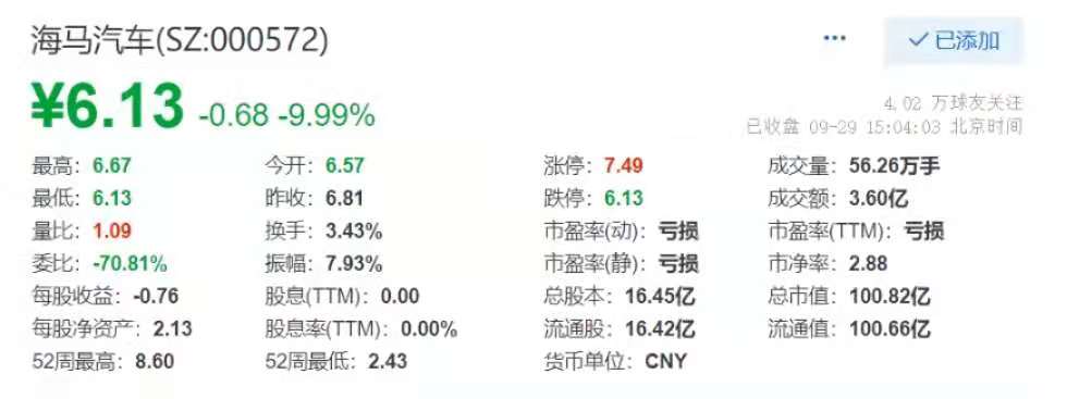 9月29日,截至收盘,海马汽车(SZ:000572)收跌9.99%,现报6.13元;成交额为3.6亿元,总市值为100.82亿元。