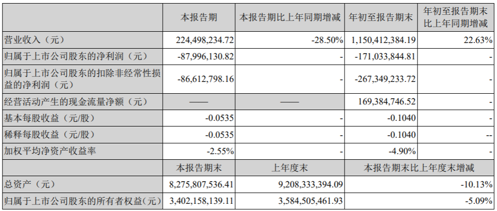 前三季度,公司实现营业收入约11.5亿元,同比增长22.63%;归属于上市公司股东的净利润约为-1.71亿元。
