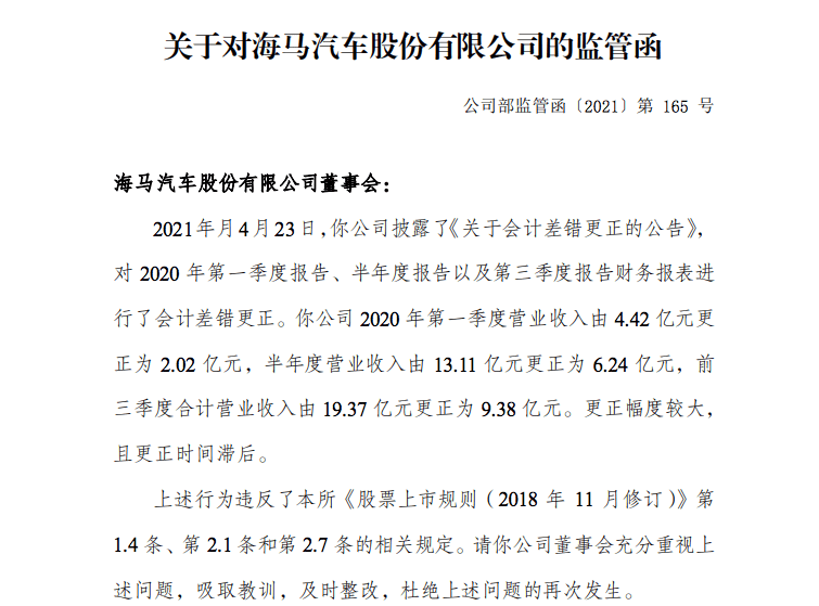 11月1日,海马汽车收到深交所监管函,涉及2020年三份财报更正幅度较大、且更正时间滞后等问题。