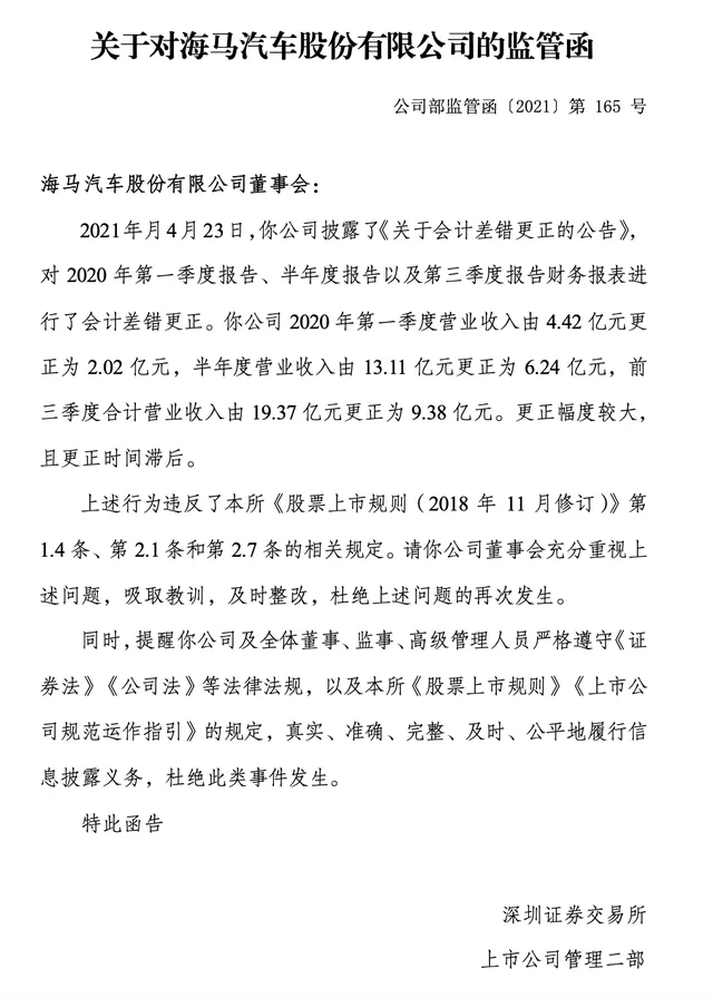 监管函认为,海马汽车财报更正幅度较大,且更正时间滞后。上述行为违反了本所《股票上市规则(2018 年 11 月修订)》第1.4条、第2.1条和第2.7条的相关规定。深交所要求海马汽车董事会充分重视上述问题,吸取教训,及时整改,杜绝上述问题的再次发生。