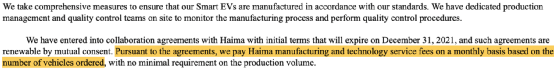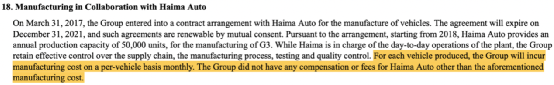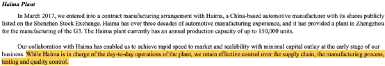 小鹏汽车2020年8月披露的招股书显示,公司于2017年3月与海马汽车签署汽车制造协议,根据协议,海马汽车每年提供G3车型5万辆产能,尽管海马汽车负责工厂的日常运营,但小鹏汽车保留汽车制造、测试与质控的全供应链控制。需要特别注意的是,对于海马汽车提供的汽车制造服务,小鹏汽车仅每月根据订单产量向海马汽车支付制造服务费用,除此以外未支付其他补偿或费用。