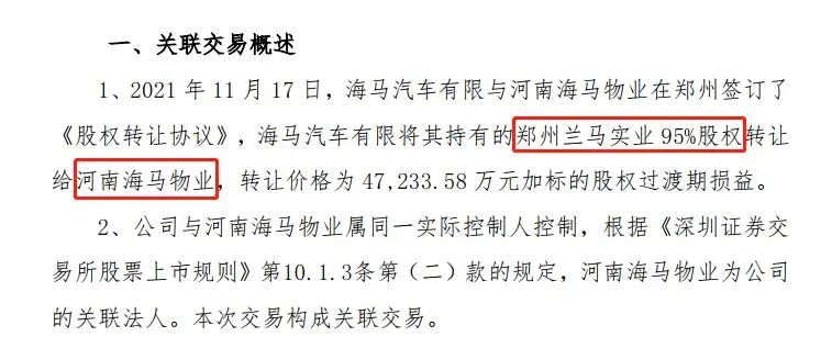 11月17日晚间,海马汽车公告,全资子公司海马汽车有限公司(下称:海马汽车有限)与河南海马物业在郑州签订了《股权转让协议》,海马汽车有限将其持有的郑州兰马实业95%股权转让给河南海马物业,转让价格为4.72亿元加标的股权过渡期损益。