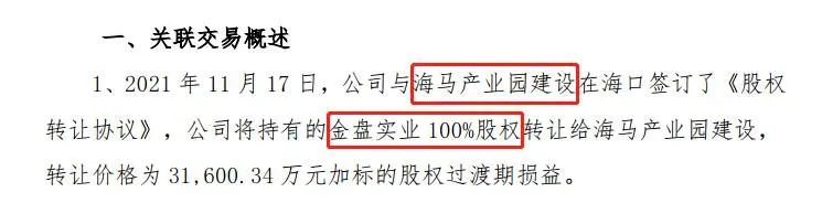 同日,海马汽车还与海马产业园建设在海口签订了《股权转让协议》,公司将持有的金盘实业100%股权转让给海马产业园建设,转让价格为3.16亿元加标的股权过渡期损益。