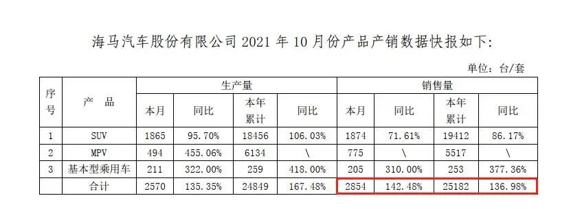 从销量端看,受益于小鹏汽车销量增长,海马汽车也呈现大幅增长趋势。11月5日,海马汽车发布10月产销数据显示,公司10月产量为2570辆,同比增长135.35%,环比增长145%;前10月累计产量为24849辆,同比增长167.48%。