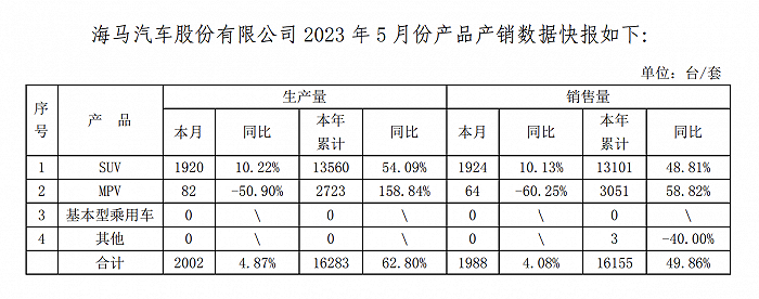 海马汽车6月6日发布2023年5月份产销数据,2023年5月合计生产汽车2002台,同比上涨4.87%;本年累计生产16283台,同比上涨62.8%。5月合计销量1988台,同比上涨4.08%;本年累计销量16155台,同比上涨49.86%。