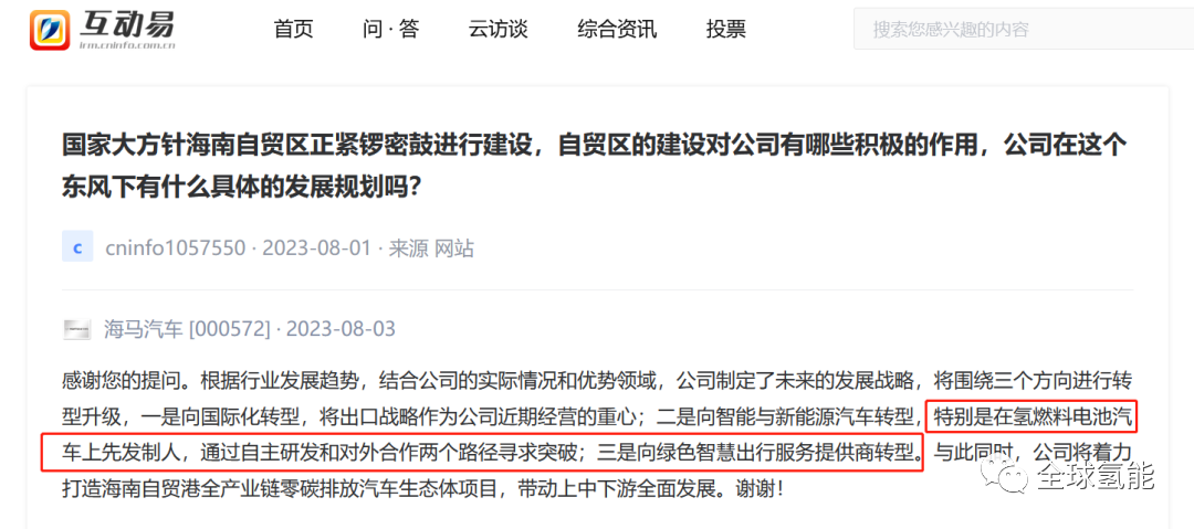 2023年1月31日,海马汽车在投资者互动平台表示,第四代氢能样车海马7X-H已于2022年底下线;采用全新电堆的氢能汽车亦已正式启动开发,计划于2023年下半年开展模拟示范运营,结合海南自贸港优越的政策环境与区位优势,争取在氢能汽车产业生态上形成差异化竞争优势。