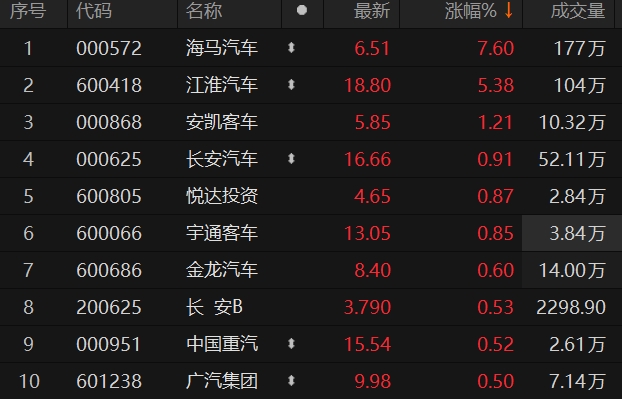 11月20日,汽车整车板块快速反弹,截至9时55分,海马汽车涨超7%,江淮汽车涨超5%,安凯客车、长安汽车、宇通客车等跟涨。